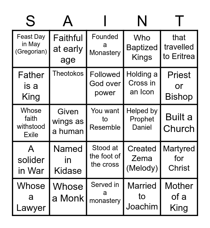 This bingo card has a free space and 24 words: Named in Kidase, Whose a Monk, Followed God over power, Whose a Lawyer, that travelled to Eritrea, Feast Day in May (Gregorian), Father is a King, Faithful at early age, Helped by Prophet Daniel, Stood at the foot of the cross, Holding a Cross in an Icon, Whose faith withstood Exile, Created Zema (Melody), Martyred for Christ, Theotokos, Married to Joachim, Built a Church, Founded a Monastery, Priest or Bishop, Given wings as a human, Mother of a King, A solider in War, Who Baptized Kings and Served in a monastery.