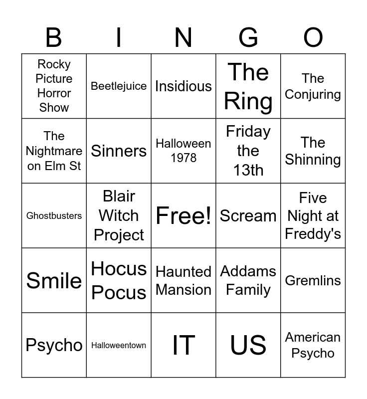 This bingo card has a free space and 24 words: Hocus Pocus, Halloweentown, Halloween 1978, Psycho, The Conjuring, Rocky Picture Horror Show, The Nightmare on Elm St, Beetlejuice, Scream, Haunted Mansion, Friday the 13th, Ghostbusters, Addams Family, Gremlins, Sinners, US, Five Night at Freddy's, Insidious, The Shinning, Blair Witch Project, American Psycho, Smile, The Ring and IT.