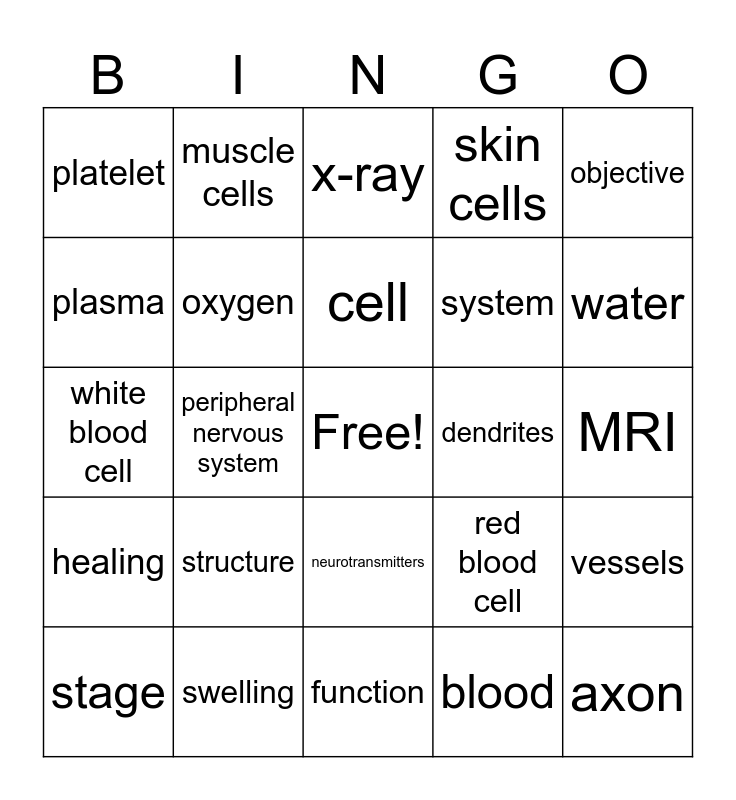 This bingo card has a free space and 25 words: structure, function, cell, stage, objective, platelet, plasma, muscle cells, dendrites, neurotransmitters, system, white blood cell, red blood cell, vessels, oxygen, spinal cord, MRI, x-ray, water, peripheral nervous system, axon, swelling, healing, skin cells and blood.