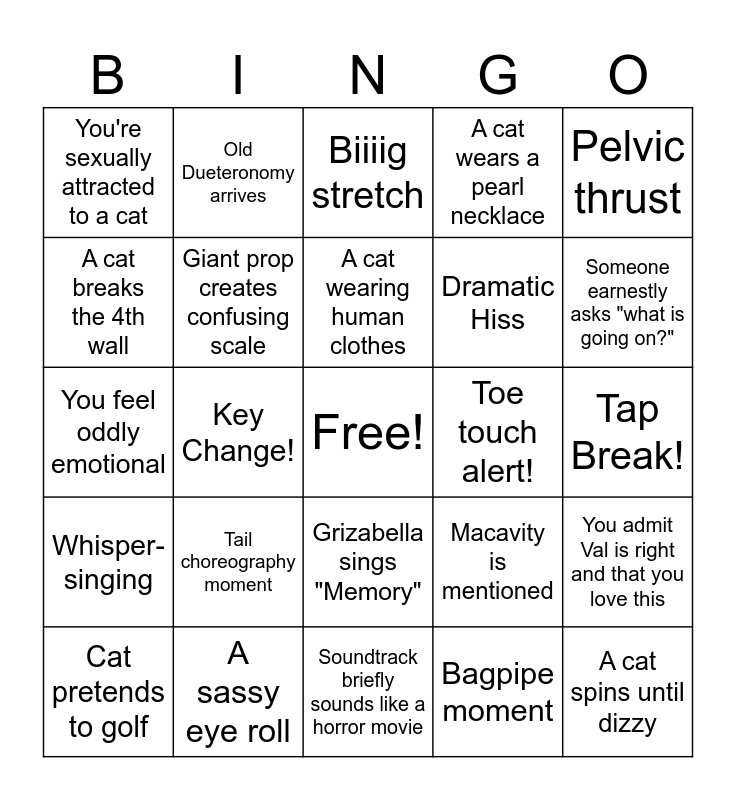 This bingo card has a free space and 25 words: Tail choreography moment, Soundtrack briefly sounds like a horror movie, A cat wearing human clothes, Cat pretends to golf, Pelvic thrust, You're sexually attracted to a cat, A cat breaks the 4th wall, Old Dueteronomy arrives, Toe touch alert!, Grizabella sings "Memory", Dramatic Hiss, You feel oddly emotional, Macavity is mentioned, You admit Val is right and that you love this, Giant prop creates confusing scale, Intense sniffing, Tap Break!, Biiiig stretch, Someone earnestly asks "what is going on?", Key Change!, A cat spins until dizzy, A sassy eye roll, Whisper-singing, A cat wears a pearl necklace and Bagpipe moment.