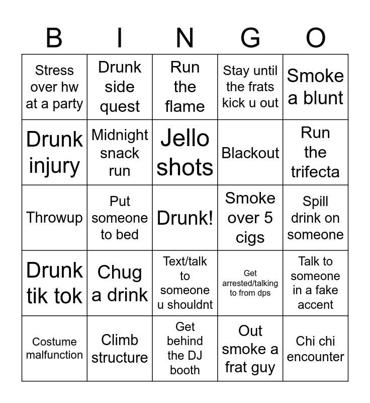 This bingo card has a free space and 24 words: Chug a drink, Climb structure, Jello shots, Costume malfunction, Smoke a blunt, Stress over hw at a party, Drunk injury, Drunk side quest, Smoke over 5 cigs, Text/talk to someone u shouldnt, Blackout, Throwup, Get arrested/talking to from dps, Talk to someone in a fake accent, Midnight snack run, Out smoke a frat guy, Spill drink on someone, Run the flame, Run the trifecta, Put someone to bed, Chi chi encounter, Drunk tik tok, Stay until the frats kick u out and Get behind the DJ booth.