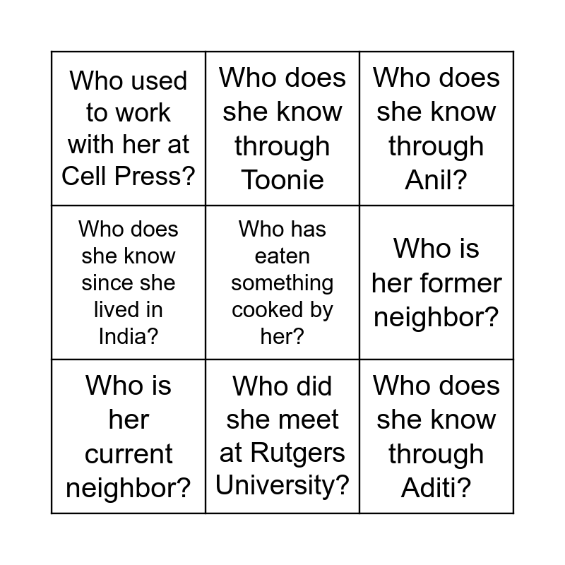 This bingo card has a free space and 8 words: Who is her former neighbor?, Who does she know through Anil?, Who does she know through Toonie, Who is her current neighbor?, Who used to work with her at Cell Press?, Who does she know through Aditi?, Who does she know since she lived in India? and Who did she meet at Rutgers University?.