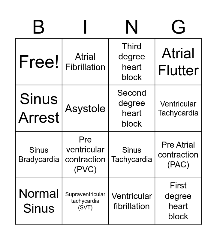This bingo card has 16 words: Normal Sinus, Supraventricular tachycardia (SVT), Third degree heart block, Atrial Flutter, Sinus Arrest, Atrial Fibrillation, Sinus Tachycardia, Pre Atrial contraction (PAC), Free!, Asystole, Ventricular fibrillation, Ventricular Tachycardia, Sinus Bradycardia, Pre ventricular contraction (PVC), Second degree heart block and First degree heart block.