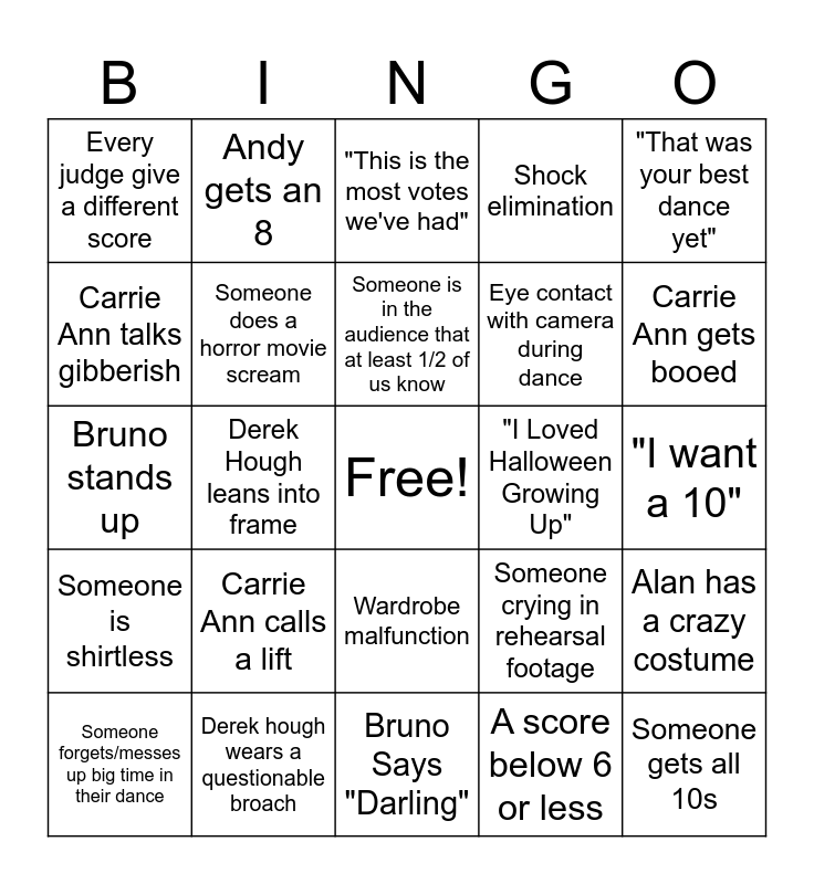 This bingo card has a free space and 31 words: Bruno Says "Darling", Judges demonstrate a critique, Derek Hough leans into frame, Bruno mentions "hip action", Every judge give a different score, "This is the most votes we've had", Someone does a horror movie scream, Someone crying in rehearsal footage, "I Loved Halloween Growing Up", A score below 6 or less, "I want a 10", Someone gets all 10s, Judges go over time, "At this point in the competition", Carrie Ann gets booed, Julianne asks a CRAZY question, Alan has a crazy costume, Carrie Ann calls a lift, Someone is shirtless, Wardrobe malfunction, "That was your best dance yet", Danielle does her famous leg kick, Someone forgets/messes up big time in their dance, Andy gets an 8, Eye contact with camera during dance, Carrie Ann talks gibberish, Shock elimination, Bruno stands up, Derek hough wears a questionable broach, Someone is in the audience that at least 1/2 of us know and Bruno's shirt is either see-through or unbuttoned severely.