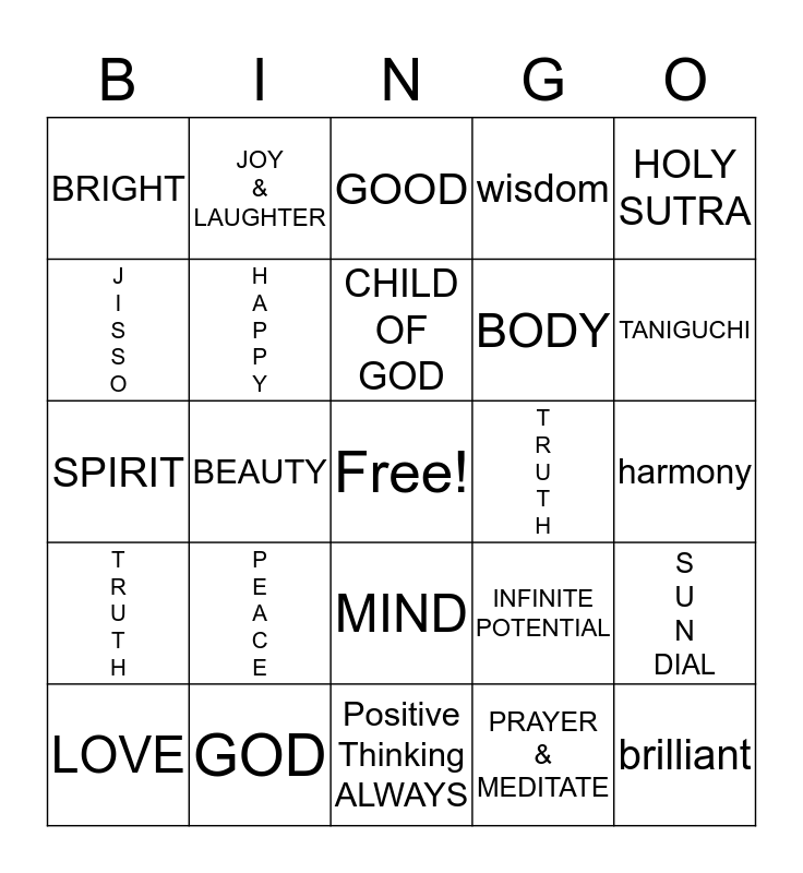 This bingo card has a free space and 24 words: P E A C E, GOD, CHILD OF GOD, LOVE, HOLY SUTRA, BRIGHT, J I S S O, JOY & LAUGHTER, T R U T H, MIND, BODY, SPIRIT, INFINITE POTENTIAL, S U N DIAL, H A P P Y, PRAYER & MEDITATE, harmony, GOOD, TANIGUCHI, BEAUTY, brilliant, T R U T H, wisdom and Positive Thinking ALWAYS.