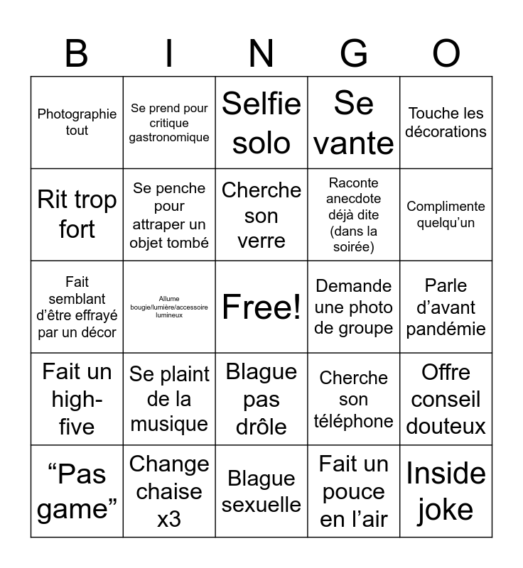 This bingo card has a free space and 24 words: Se plaint de la musique, Change chaise x3, Cherche son verre, “Pas game”, Touche les décorations, Photographie tout, Rit trop fort, Se prend pour critique gastronomique, Demande une photo de groupe, Blague pas drôle, Raconte anecdote déjà dite (dans la soirée), Fait semblant d’être effrayé par un décor, Cherche son téléphone, Offre conseil douteux, Se penche pour attraper un objet tombé, Fait un pouce en l’air, Parle d’avant pandémie, Selfie solo, Complimente quelqu’un, Allume bougie/lumière/accessoire lumineux, Inside joke, Fait un high-five, Se vante and Blague sexuelle.