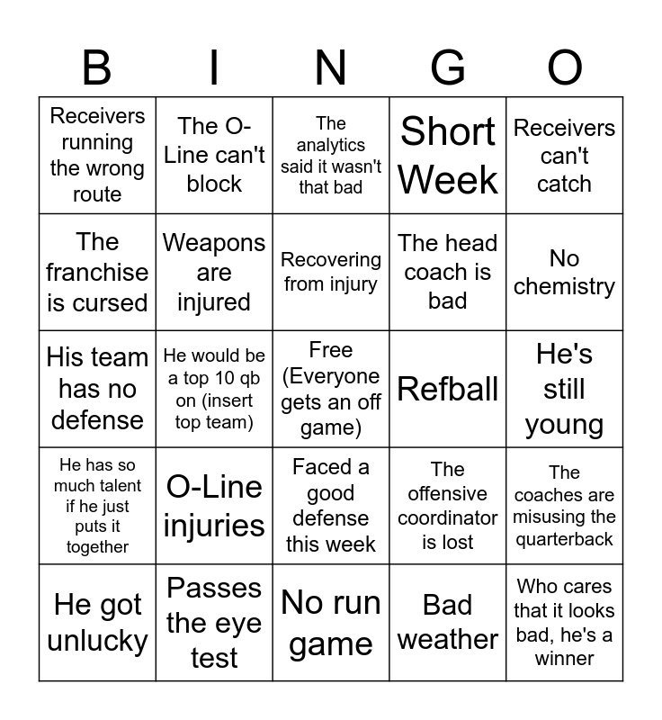This bingo card has a free space and 25 words: O-Line injuries, No run game, Recovering from injury, He got unlucky, Receivers can't catch, Receivers running the wrong route, The franchise is cursed, The O-Line can't block, Refball, Faced a good defense this week, The head coach is bad, His team has no defense, The offensive coordinator is lost, The coaches are misusing the quarterback, Weapons are injured, Quarterback is playing with rookies or players with minimal starting experience, He's still young, The analytics said it wasn't that bad, No chemistry, He would be a top 10 qb on (insert top team), Who cares that it looks bad, he's a winner, Passes the eye test, He has so much talent if he just puts it together, Short Week and Bad weather.
