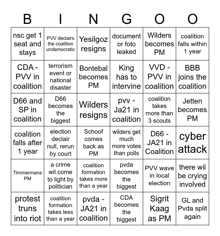 This bingo card has 42 words: Sigrit Kaag as PM, terrorism event or national disaster, VVD - PvdA in coalition, coalition takes more than 3 scouts, cyber attack, election declair null, rerun by court, D66 and SP in coalition, journalist gets attacked, Yesilgoz resigns, Jetten becomes PM, Wilders resigns, King has to intervine, BBB joins the coalition, Wilders becomes PM, coalition formation takes less than a year, coalition falls after 1 year, there wil be crying involved, VVD - PVV in coalition, GL and Pvda split again, PVV declairs the coalition undemocratic, coalition falls within 1 year, coalition formation takes more than a year, Timmermans PM, nsc get 1 seat and stays, Coalition fails, new election, protest truns into riot, Bontebal becomes PM, Timmermans resigns, a crime wil come to light by politician, PVV wave in local election, coalition involves canabalism, pvv - Ja21 in coalition, CDA - PVV in coalition, D66 - JA21 in Coalition, pvda - JA21 in coalition, Schoof comes back as PM, wilders get much more votes than polls, D66 becomes the biggest, pvda becomes the biggest, CDA becomes the biggest, document or foto leaked and demitionair government will mess something up.