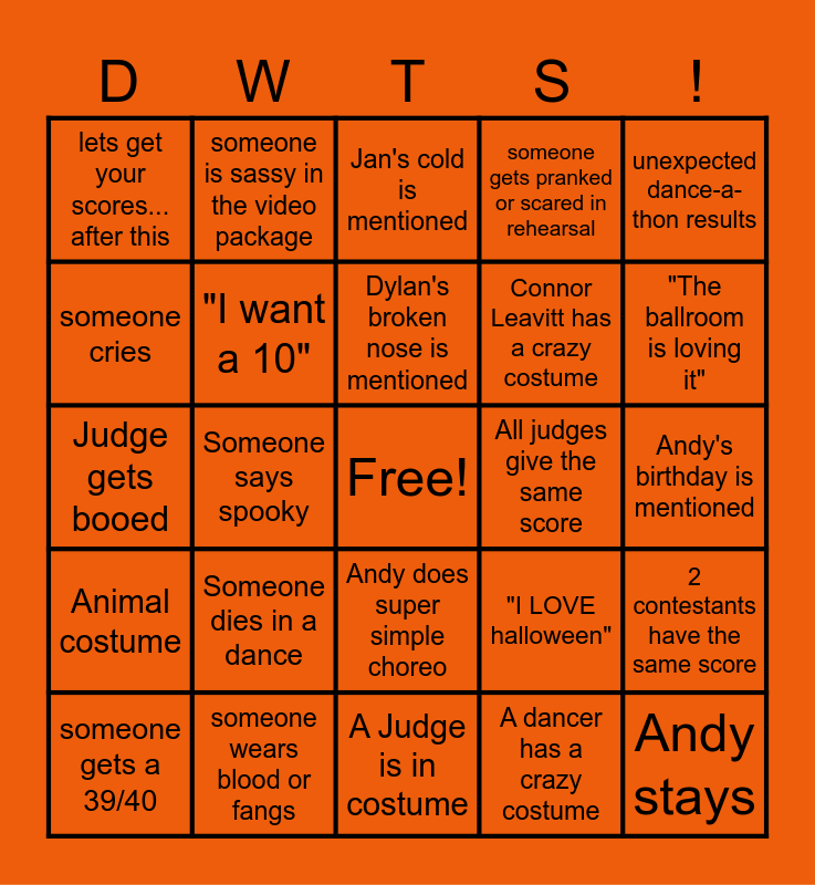 This bingo card has a free space and 24 words: Someone dies in a dance, someone wears blood or fangs, Dylan's broken nose is mentioned, someone gets a 39/40, unexpected dance-a-thon results, lets get your scores... after this, someone cries, someone is sassy in the video package, All judges give the same score, Andy does super simple choreo, Connor Leavitt has a crazy costume, Judge gets booed, "I LOVE halloween", 2 contestants have the same score, "I want a 10", A dancer has a crazy costume, Andy's birthday is mentioned, Jan's cold is mentioned, "The ballroom is loving it", Someone says spooky, Andy stays, Animal costume, someone gets pranked or scared in rehearsal and A Judge is in costume.
