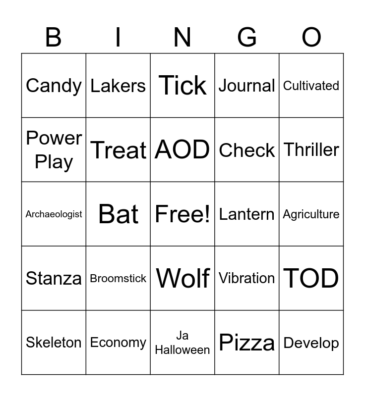 This bingo card has a free space and 29 words: Skeleton, Pumpkin, Bat, Cobweb, Candy, Tick, Treat, Broomstick, Lantern, Economy, Agriculture, Develop, Ja Halloween, Pizza, Thriller, Scarecrow, Wolf, Stanza, Cultivated, Archaeologist, Vibration, Vacuum, Check, Power Play, Journal, Lakers, TOD, AOD and POD.