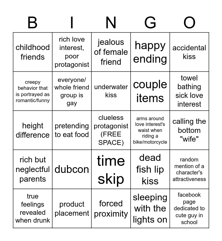 This bingo card has a free space and 34 words: trip to the beach, sleeping with the lights on, singing and/or playing guitar, tragic back story, rich but neglectful parents, everyone/ whole friend group is gay, accidental kiss, true feelings revealed when drunk, rich love interest, poor protagonist, grabbing wrist to drag him somewhere, underwater kiss, jealous of female friend, huge conflict that can easily be fixed with communication, enemies to lovers, arms around love interest's waist when riding a bike/motorcycle, towel bathing sick love interest, product placement, height difference, dubcon, dead fish lip kiss, time skip, tending to wounds, childhood friends, calling the bottom "wife", forced proximity, facebook page dedicated to cute guy in school, happy ending, lack of female characters, couple items, creepy behavior that is portrayed as romantic/funny, bad acting, pretending to eat food, random mention of a character's attractiveness and wiping off food on lip.