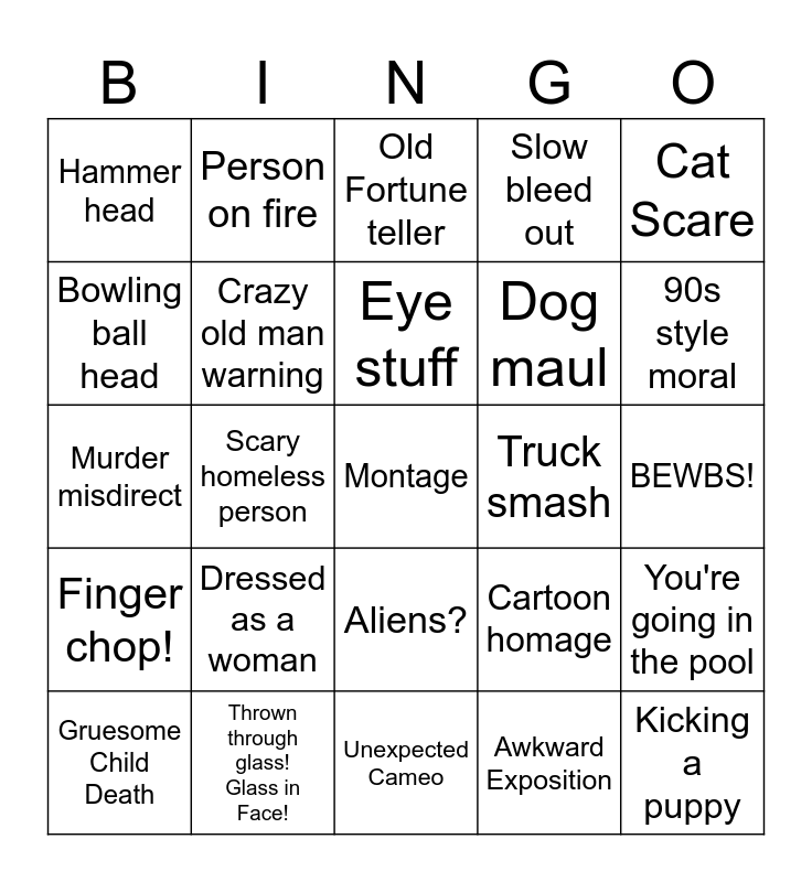 This bingo card has a free space and 24 words: Dressed as a woman, Thrown through glass! Glass in Face!, Eye stuff, Gruesome Child Death, Cat Scare, Hammer head, Bowling ball head, Person on fire, Truck smash, Aliens?, Dog maul, Murder misdirect, Cartoon homage, You're going in the pool, Crazy old man warning, Awkward Exposition, BEWBS!, Old Fortune teller, 90s style moral, Scary homeless person, Kicking a puppy, Finger chop!, Slow bleed out and Unexpected Cameo.