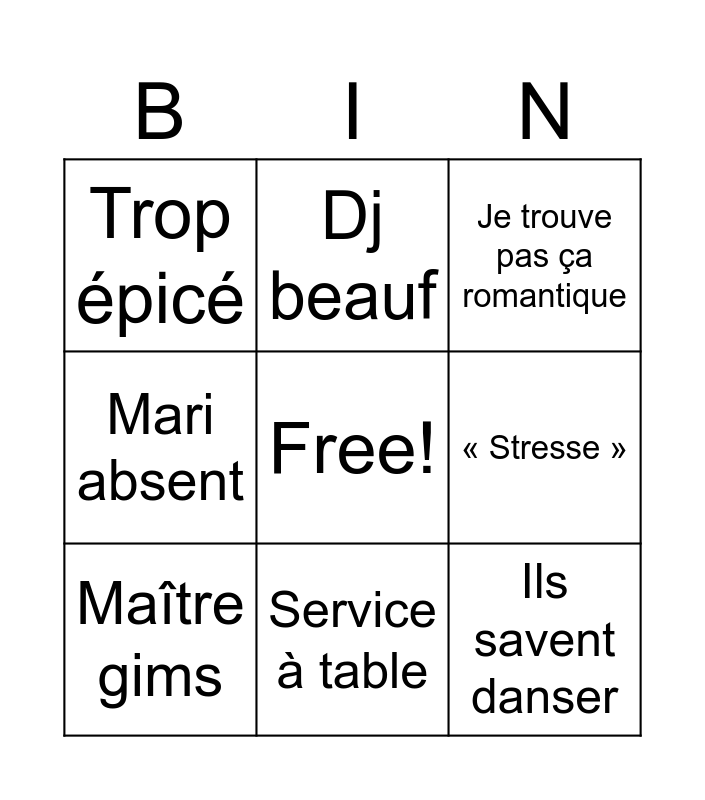 This bingo card has a free space and 8 words: « Stresse », Je trouve pas ça romantique, Dj beauf, Maître gims, Trop épicé, Ils savent danser, Mari absent and Service à table.