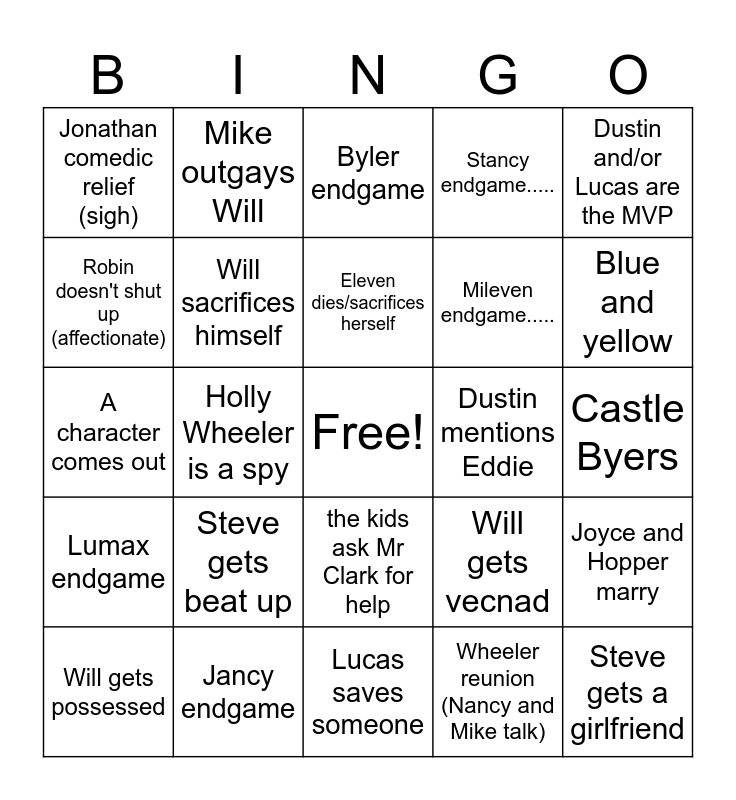 This bingo card has a free space and 24 words: Steve gets beat up, Jancy endgame, Eleven dies/sacrifices herself, Will gets possessed, Dustin and/or Lucas are the MVP, Jonathan comedic relief (sigh), Robin doesn't shut up (affectionate), Mike outgays Will, Dustin mentions Eddie, the kids ask Mr Clark for help, Mileven endgame....., A character comes out, Will gets vecnad, Joyce and Hopper marry, Will sacrifices himself, Wheeler reunion (Nancy and Mike talk), Castle Byers, Byler endgame, Blue and yellow, Holly Wheeler is a spy, Steve gets a girlfriend, Lumax endgame, Stancy endgame..... and Lucas saves someone.