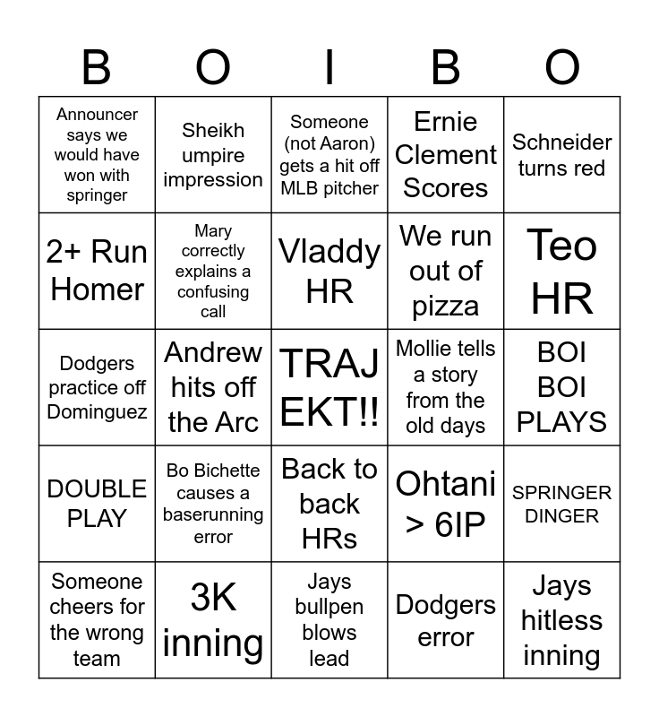 This bingo card has a free space and 27 words: Brendon Little pitches, 3K inning, Vladdy HR, Dodgers error, Schneider turns red, 2+ Run Homer, Sheikh umpire impression, Jays bullpen blows lead, Mollie tells a story from the old days, SPRINGER DINGER, DOUBLE PLAY, Mary correctly explains a confusing call, Ohtani > 6IP, Jays hitless inning, Dodgers practice off Dominguez, Team runs out of challenges, Someone (not Aaron) gets a hit off MLB pitcher, Ernie Clement Scores, BOI BOI PLAYS, Announcer says we would have won with springer, Bo Bichette causes a baserunning error, Back to back HRs, We run out of pizza, Teo HR, Someone cheers for the wrong team, Andrew hits off the Arc and Canada Airs Apology Ad.