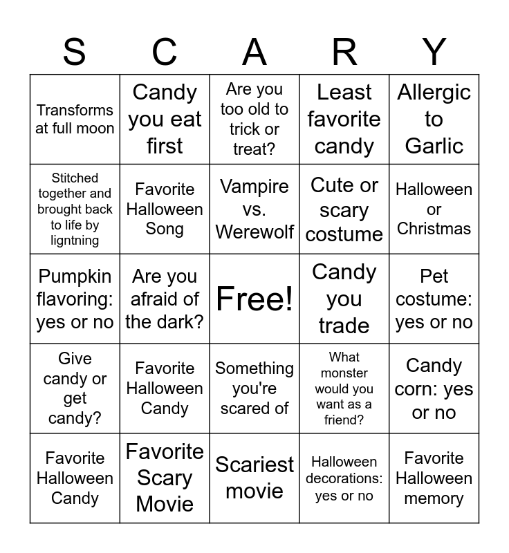 This bingo card has a free space and 24 words: Favorite Halloween Candy, Favorite Scary Movie, Vampire vs. Werewolf, Favorite Halloween Candy, Allergic to Garlic, Transforms at full moon, Stitched together and brought back to life by ligntning, Candy you eat first, Candy you trade, Something you're scared of, Cute or scary costume, Pumpkin flavoring: yes or no, What monster would you want as a friend?, Candy corn: yes or no, Favorite Halloween Song, Halloween decorations: yes or no, Pet costume: yes or no, Are you too old to trick or treat?, Halloween or Christmas, Are you afraid of the dark?, Favorite Halloween memory, Give candy or get candy?, Least favorite candy and Scariest movie.