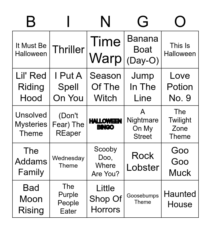 This bingo card has a free space and 60 words: Monster Mash, The Purple People Eater, Spooky Scary Skeletons, The Addams Family, Goosebumps Theme, Ghostbusters, I Put A Spell On You, Witch Doctor, Jump In The Line, Somebody's Watching Me, Banana Boat (Day-O), Transylvania Twist, Lil' Red Riding Hood, Sinister Stomp, Casper The Friendly Ghost, It Must Be Halloween, Haunted House, This Is Halloween, Blood Mary, Season Of The Witch, A Nightmare On My Street, Time Warp, Bad Moon Rising, Goo Goo Muck, Superstition, Black Magic Woman, Witchy Woman, Heads Will Roll, Love Potion No. 9, Freaks Come Out At Night, Devil Woman, Suddenly, Seymour, Say My Name, One Way Or Another, Thriller, Calling All The Monsters, Kidnap The Sandy Claws, (Don't Fear) The REaper, Halloween Theme, Unsolved Mysteries Theme, Puttin' On the Ritz, Wednesday Theme, The Twilight Zone Theme, The Munsters Theme, Rock Lobster, Werewolves Of London, Poor Unfortunate Souls, We Don't Talk About Bruno, Frankenstein Twist, Scooby Doo, Where Are You?, Little Shop Of Horrors, Let's Twist Again, Ding-Dong! The Witch Is Dead, Let's Kill Tonight, Swamp Witch, Midnight Monsters Hop, It's Terror Time Again, My Undead Mummy And Me, Spiders & Snakes and Jeepers Creepers.