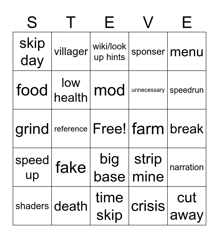 This bingo card has a free space and 24 words: fake, death, mod, shaders, menu, skip day, food, villager, farm, big base, unnecessary, grind, strip mine, narration, low health, crisis, break, wiki/look up hints, speedrun, reference, cut away, speed up, sponser and time skip.