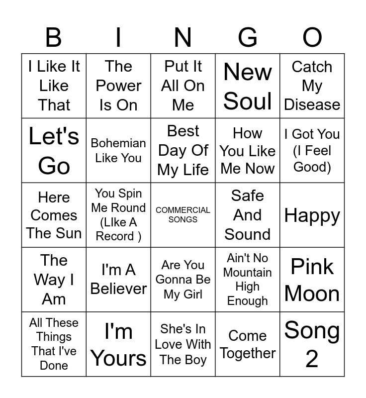 This bingo card has a free space and 47 words: Crazy In Love, Song 2, Viva La Vida, She's In Love With The Boy, I'm A Believer, Young Folks, The Power Is On, Come And Get It, Let's Go, Sweet Disposition, Bohemian Like You, New Soul, Pink Moon, Ain't No Mountain High Enough, Frankenstein, Feel It Still, Best Day Of My Life, Safe And Sound, Upside Down, Catch My Disease, You Spin Me Round (LIke A Record ), Come Together, I Like It Like That, How You Like Me Now, Don't Stop Me Now, I Got You (I Feel Good), All These Things That I've Done, Let's Groove, Are You Gonna Be My Girl, The Way I Am, Start Me Up, Take A Walk, Good Feeling, Sweet Caroline, Shiny Happy People, I'm Yours, Happy, Go Your Own Way, It's A Beautiful Day, Walking On Sunshine, You Make My Dreams (Come True), Put It All On Me, Here Comes The Sun, Ho Hey, Take Me Home, Magic and Best Song Ever.
