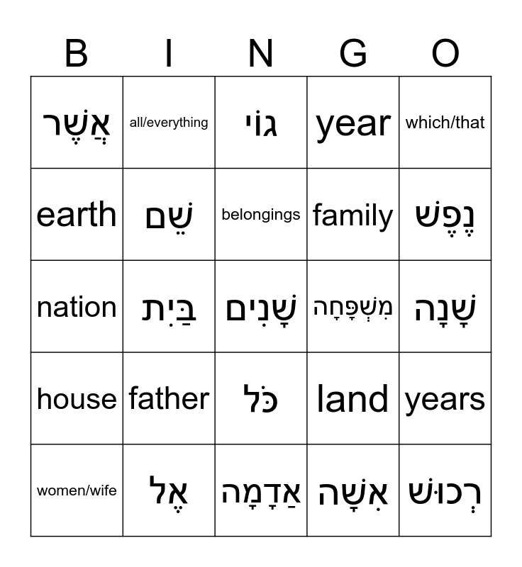 This bingo card has 30 words: אֶל, אֶרֶץ, בַּיִת, אָב, אֲשֶׁר, גוֹי, שֵׁם, כֹּל, מִשְׁפָּחָה, אַדָמָה, שָׁנָה, שָׁנִים, אִשָׁה, רְכוּשׁ, נֶפֶשׁ, to, land, house, father, which/that, nation, name, all/everything, family, earth, year, years, women/wife, belongings and life/person.