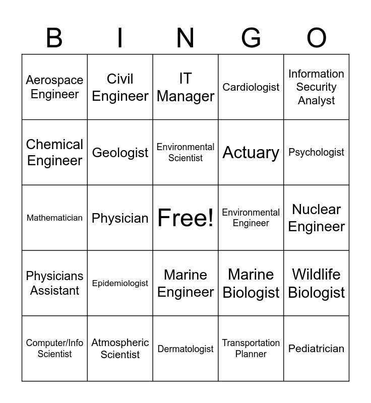 This bingo card has a free space and 24 words: Epidemiologist, Atmospheric Scientist, Environmental Scientist, Computer/Info Scientist, Information Security Analyst, Aerospace Engineer, Chemical Engineer, Civil Engineer, Environmental Engineer, Marine Engineer, Actuary, Mathematician, Marine Biologist, Wildlife Biologist, Geologist, Transportation Planner, Nuclear Engineer, IT Manager, Psychologist, Physician, Pediatrician, Physicians Assistant, Cardiologist and Dermatologist.