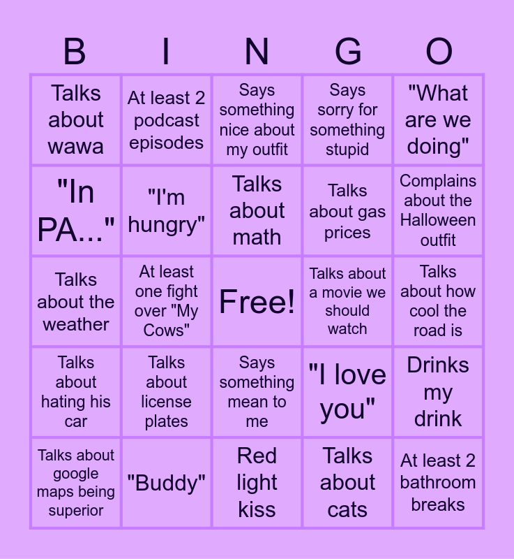 This bingo card has a free space and 24 words: Talks about license plates, "Buddy", Talks about math, Talks about google maps being superior, "What are we doing", Talks about wawa, "In PA...", At least 2 podcast episodes, Talks about a movie we should watch, Says something mean to me, Talks about gas prices, Talks about the weather, "I love you", Drinks my drink, "I'm hungry", Talks about cats, Talks about how cool the road is, Says something nice about my outfit, Complains about the Halloween outfit, At least one fight over "My Cows", At least 2 bathroom breaks, Talks about hating his car, Says sorry for something stupid and Red light kiss.