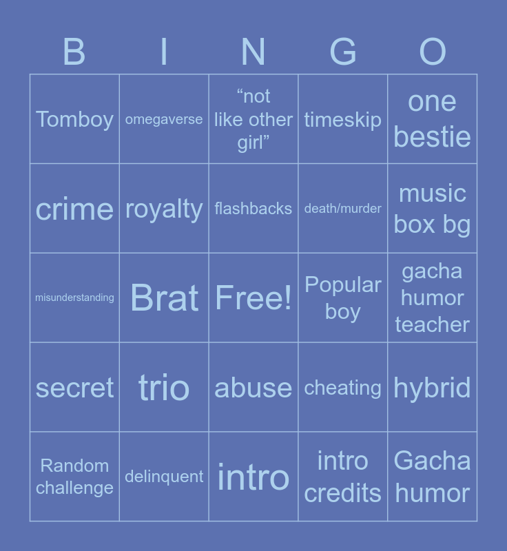 This bingo card has a free space and 29 words: Random challenge, Bully, Brat, Emo, Tomboy, “not like other girl”, royalty, trio, Popular boy, delinquent, gacha humor teacher, Gacha humor, intro, intro credits, music box bg, dead parent, abuse, secret, one bestie, misunderstanding, cheating, framed, death/murder, crime, timeskip, omegaverse, hybrid, flashbacks and glow up.