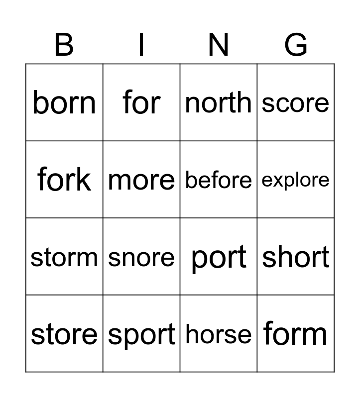 This bingo card has 16 words: sport, short, north, born, storm, for, port, horse, fork, more, store, score, snore, explore, before and form.