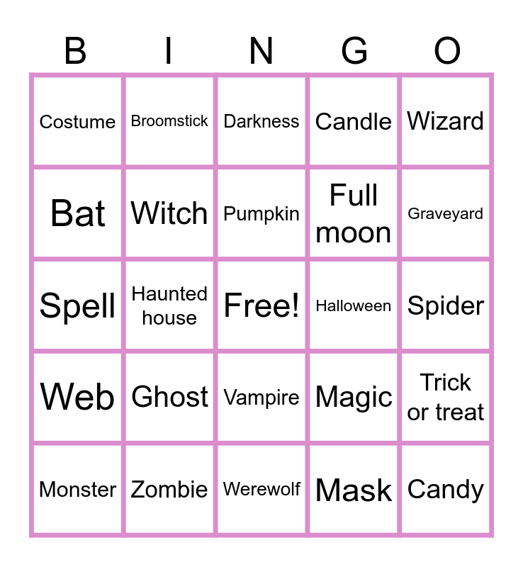 This bingo card has a free space and 24 words: Ghost, Zombie, Pumpkin, Monster, Wizard, Costume, Bat, Broomstick, Halloween, Vampire, Full moon, Spell, Magic, Trick or treat, Witch, Mask, Spider, Darkness, Graveyard, Haunted house, Candy, Web, Candle and Werewolf.