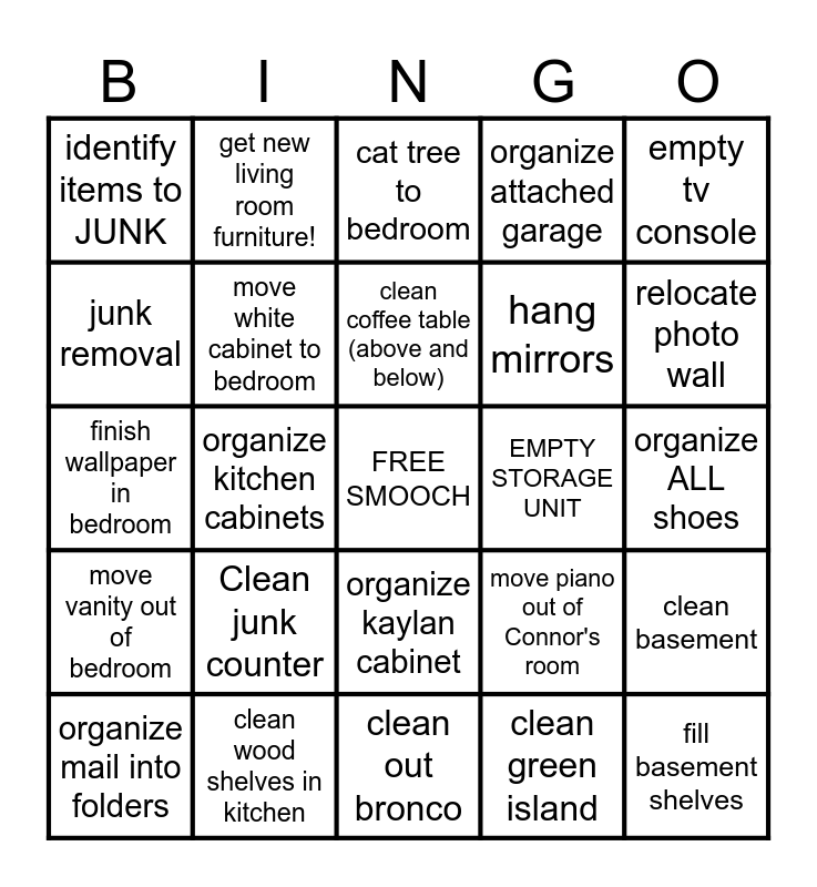 This bingo card has a free space and 24 words: Clean junk counter, clean wood shelves in kitchen, clean coffee table (above and below), organize mail into folders, empty tv console, identify items to JUNK, junk removal, get new living room furniture!, EMPTY STORAGE UNIT, organize kaylan cabinet, hang mirrors, finish wallpaper in bedroom, move piano out of Connor's room, clean basement, move white cabinet to bedroom, clean green island, organize ALL shoes, cat tree to bedroom, relocate photo wall, organize kitchen cabinets, fill basement shelves, move vanity out of bedroom, organize attached garage and clean out bronco.
