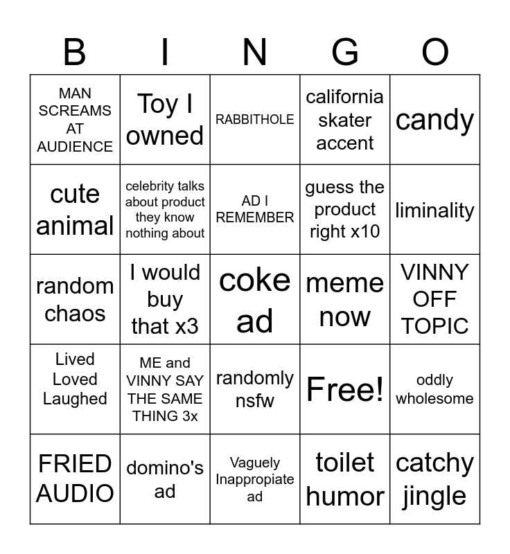 This bingo card has 25 words: ME and VINNY SAY THE SAME THING 3x, Vaguely Inappropiate ad, AD I REMEMBER, FRIED AUDIO, candy, MAN SCREAMS AT AUDIENCE, cute animal, Toy I owned, meme now, randomly nsfw, guess the product right x10, random chaos, Free!, oddly wholesome, celebrity talks about product they know nothing about, catchy jingle, VINNY OFF TOPIC, RABBITHOLE, liminality, I would buy that x3, coke ad, domino's ad, Lived Loved Laughed, california skater accent and toilet humor.