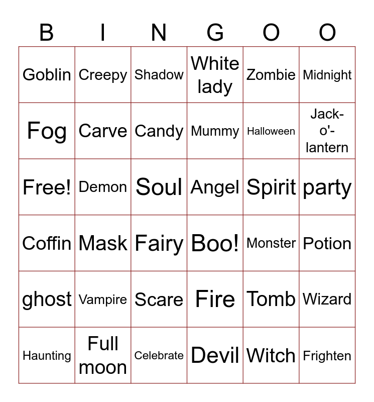 This bingo card has 36 words: Fire, Scare, Devil, Fog, Coffin, Angel, Carve, Celebrate, Zombie, Tomb, Jack-o'-lantern, White lady, Wizard, Demon, Mummy, Goblin, ghost, Spirit, Free!, Shadow, Soul, Mask, Boo!, Fairy, Monster, Creepy, Halloween, Full moon, Candy, Midnight, Frighten, Haunting, Potion, party, Vampire and Witch.