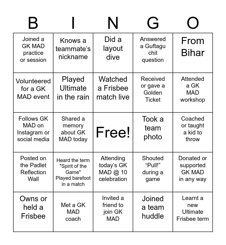 This bingo card has a free space and 24 words: Heard the term "Spirit of the Game" Played barefoot in a match, Met a GK MAD coach, Watched a Frisbee match live, Owns or held a Frisbee, From Bihar, Joined a GK MAD practice or session, Volunteered for a GK MAD event, Knows a teammate’s nickname, Took a team photo, Attending today’s GK MAD @ 10 celebration, Received or gave a Golden Ticket, Follows GK MAD on Instagram or social media, Shouted “Pull!” during a game, Donated or supported GK MAD in any way, Played Ultimate in the rain, Joined a team huddle, Coached or taught a kid to throw, Did a layout dive, Attended a GK MAD workshop, Shared a memory about GK MAD today, Learnt a new Ultimate Frisbee term, Posted on the Padlet Reflection Wall, Answered a Guftagu chit question and Invited a friend to join GK MAD.