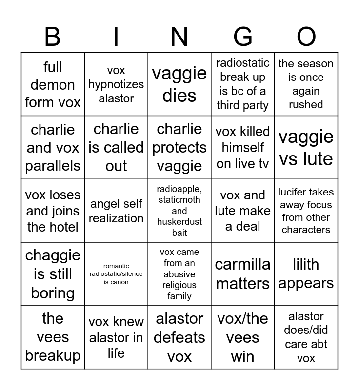 This bingo card has a free space and 24 words: romantic radiostatic/silence is canon, vox knew alastor in life, charlie protects vaggie, the vees breakup, the season is once again rushed, full demon form vox, charlie and vox parallels, vox hypnotizes alastor, vox and lute make a deal, vox came from an abusive religious family, vox killed himself on live tv, vox loses and joins the hotel, carmilla matters, lilith appears, charlie is called out, vox/the vees win, lucifer takes away focus from other characters, vaggie dies, vaggie vs lute, angel self realization, alastor does/did care abt vox, chaggie is still boring, radiostatic break up is bc of a third party and alastor defeats vox.