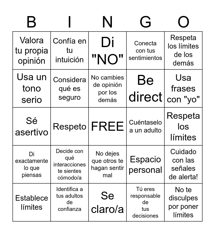 This bingo card has a free space and 24 words: Decide con qué interacciones te sientes cómodo/a, Identifica a tus adultos de confianza, No cambies de opinión por los demás, Establece límites, Respeta los límites de los demás, Valora tu propia opinión, Usa un tono serio, Confía en tu intuición, Cuéntaselo a un adulto, No dejes que otros te hagan sentir mal, Be direct, Sé asertivo, Espacio personal, Cuidado con las señales de alerta!, Considera qué es seguro, Tú eres responsable de tus decisiones, Respeta los límites, Di "NO", Usa frases con "yo", Respeto, No te disculpes por poner límites, Di exactamente lo que piensas, Conecta con tus sentimientos and Se claro/a.
