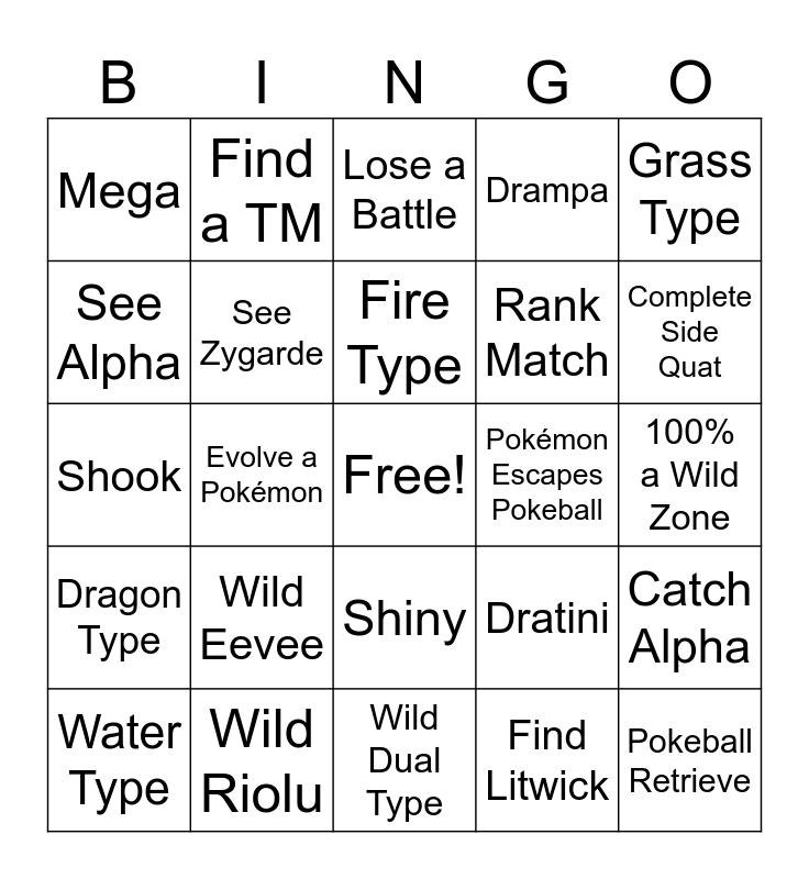 This bingo card has a free space and 24 words: Wild Eevee, Wild Riolu, Fire Type, Water Type, Grass Type, Mega, See Alpha, Find a TM, Pokémon Escapes Pokeball, Shiny, Rank Match, Shook, Dratini, Catch Alpha, See Zygarde, Find Litwick, 100% a Wild Zone, Lose a Battle, Complete Side Quat, Evolve a Pokémon, Pokeball Retrieve, Dragon Type, Drampa and Wild Dual Type.
