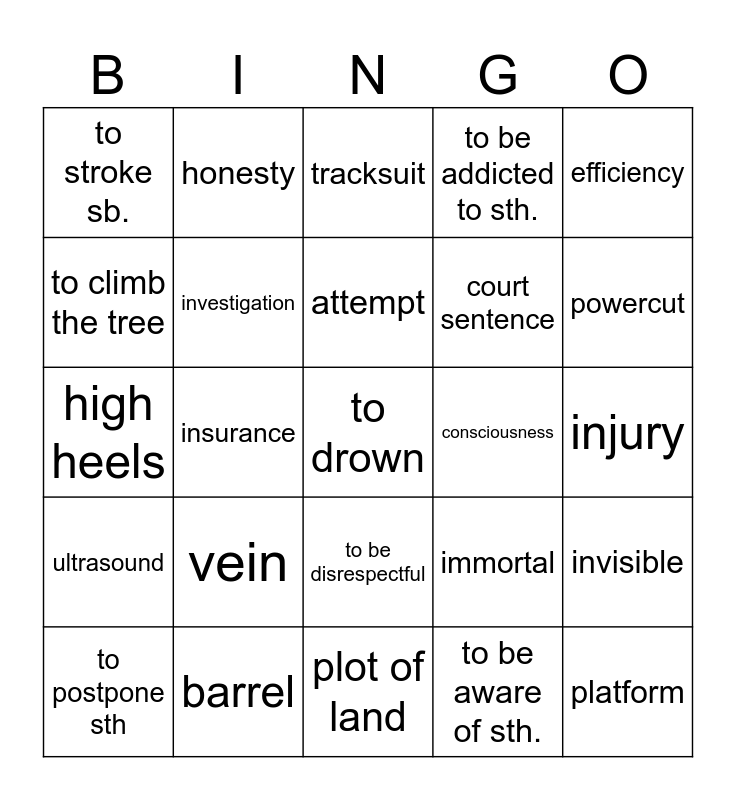 This bingo card has a free space and 24 words: vein, barrel, attempt, to postpone sth, efficiency, to stroke sb., to climb the tree, honesty, consciousness, to be disrespectful, court sentence, high heels, immortal, invisible, investigation, to be aware of sth., injury, tracksuit, powercut, insurance, platform, ultrasound, to be addicted to sth. and plot of land.