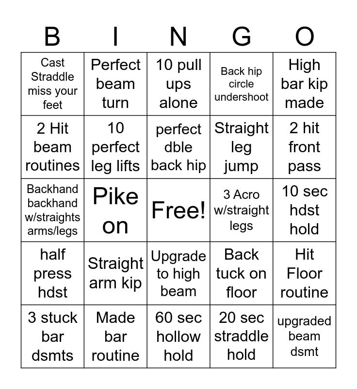 This bingo card has a free space and 24 words: Straight arm kip, Made bar routine, perfect dble back hip, 3 stuck bar dsmts, High bar kip made, Cast Straddle miss your feet, 2 Hit beam routines, Perfect beam turn, 3 Acro w/straight legs, Upgrade to high beam, Straight leg jump, Backhand backhand w/straights arms/legs, Back tuck on floor, Hit Floor routine, 10 perfect leg lifts, 20 sec straddle hold, 10 sec hdst hold, 10 pull ups alone, 2 hit front pass, Pike on, upgraded beam dsmt, half press hdst, Back hip circle undershoot and 60 sec hollow hold.