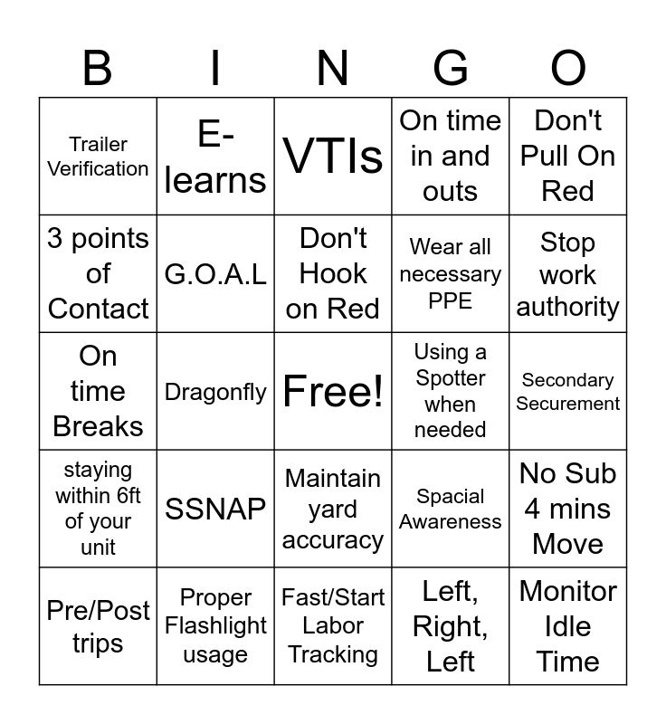 This bingo card has a free space and 28 words: No Sub 4 mins Move, Radio Etiquette, Wear all necessary PPE, Left, Right, Left, 3 points of Contact, VTIs, E-learns, staying within 6ft of your unit, Using a Spotter when needed, Pre/Post trips, On time Breaks, On time in and outs, Proper Flashlight usage, Fast/Start Labor Tracking, Stop work authority, Know your Emergency Procedures, SSNAP, G.O.A.L, Don't Hook on Red, Maintain yard accuracy, Trailer Verification, Monitor Engine Idle time, Monitor Idle Time, Dragonfly, Secondary Securement, Spacial Awareness, Don't Pull On Red and Review Policies.
