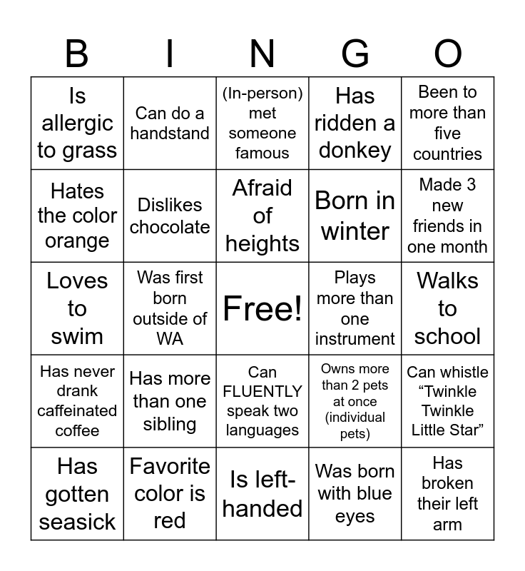 This bingo card has a free space and 25 words: Has more than one sibling, Is left-handed, Afraid of heights, Has gotten seasick, Been to more than five countries, Is allergic to grass, Hates the color orange, Can do a handstand, Plays more than one instrument, Can FLUENTLY speak two languages, Born in winter, Loves to swim, Owns more than 2 pets at once (individual pets), Can whistle “Twinkle Twinkle Little Star”, Dislikes chocolate, Been to South America, Walks to school, (In-person) met someone famous, Made 3 new friends in one month, Was first born outside of WA, Has broken their left arm, Favorite color is red, Has never drank caffeinated coffee, Has ridden a donkey and Was born with blue eyes.