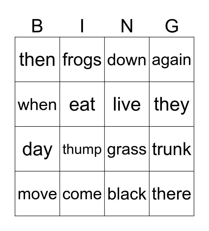 This bingo card has 60 words: her, all, could, there, want, call, live, here, day, who, again, three, eat, under, new, then, move, when, make, they, come, down, said, does, what, about, from, shack, thump, wish, this, romp, ants, stomp, frogs, land, drink, trunk, grand, grass, pink, stop, black, blend, glad, plants, crisp, printing, think, thank, fish, wish, crack, slim, fast, wink, crimp, slug, flag and snack.