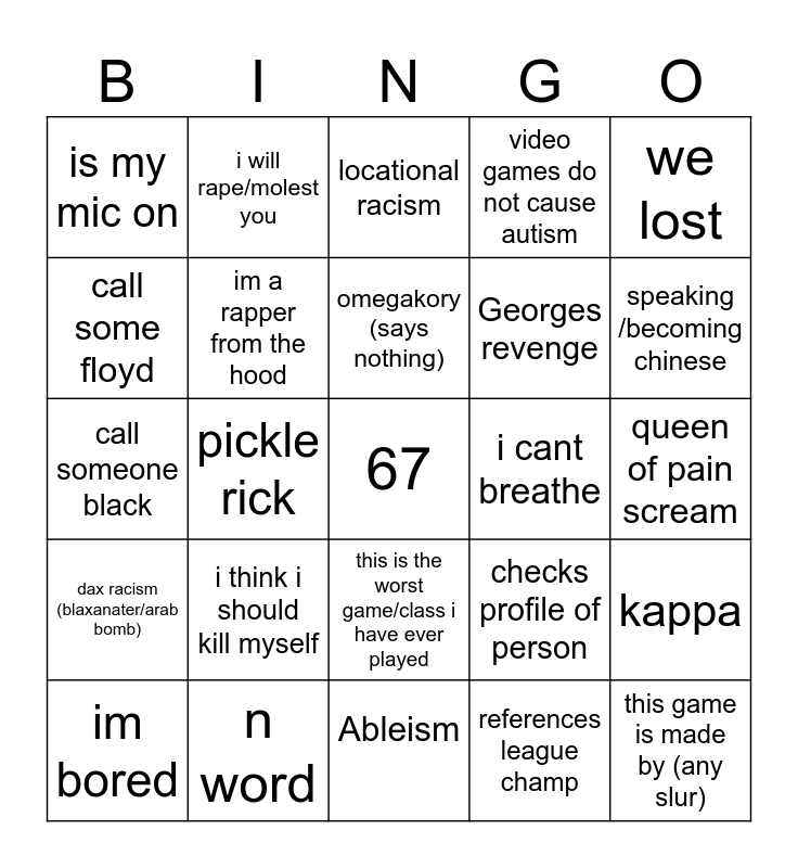 This bingo card has a free space and 24 words: i think i should kill myself, n word, omegakory (says nothing), im bored, we lost, is my mic on, call some floyd, i will rape/molest you, i cant breathe, this is the worst game/class i have ever played, Georges revenge, call someone black, checks profile of person, kappa, im a rapper from the hood, references league champ, queen of pain scream, locational racism, speaking /becoming chinese, pickle rick, this game is made by (any slur), dax racism (blaxanater/arab bomb), video games do not cause autism and Ableism.