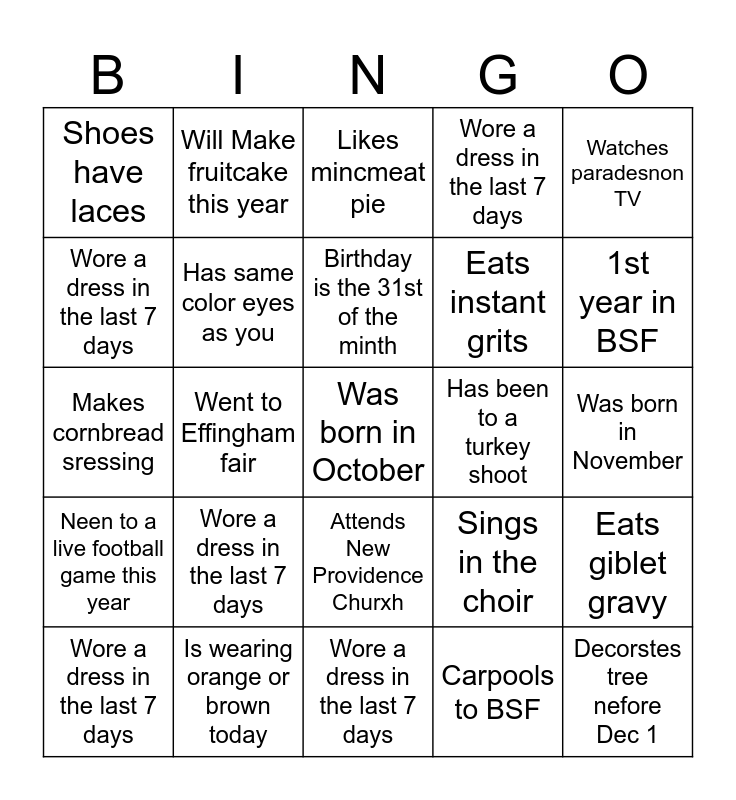 This bingo card has 30 words: Wore a dress in the last 7 days, Has started Christmas shopping, Birthday is the 31st of the minth, Watches UGA football, Watches paradesnon TV, Shoes have laces, Will Make fruitcake this year, Attends New Providence Churxh, Has been to a turkey shoot, Decorstes tree nefore Dec 1, Neen to a live football game this year, Has same color eyes as you, Prefers King James Bible, Carpools to BSF, Eats giblet gravy, Is not musically inclined, Went to Effingham fair, Was born in October, Sings in the choir, 1st year in BSF, Makes cornbread sressing, Is wearing orange or brown today, Likes mincmeat pie, Eats instant grits, Was born in November, Wore a dress in the last 7 days, Wore a dress in the last 7 days, Wore a dress in the last 7 days, Wore a dress in the last 7 days and Wore a dress in the last 7 days.