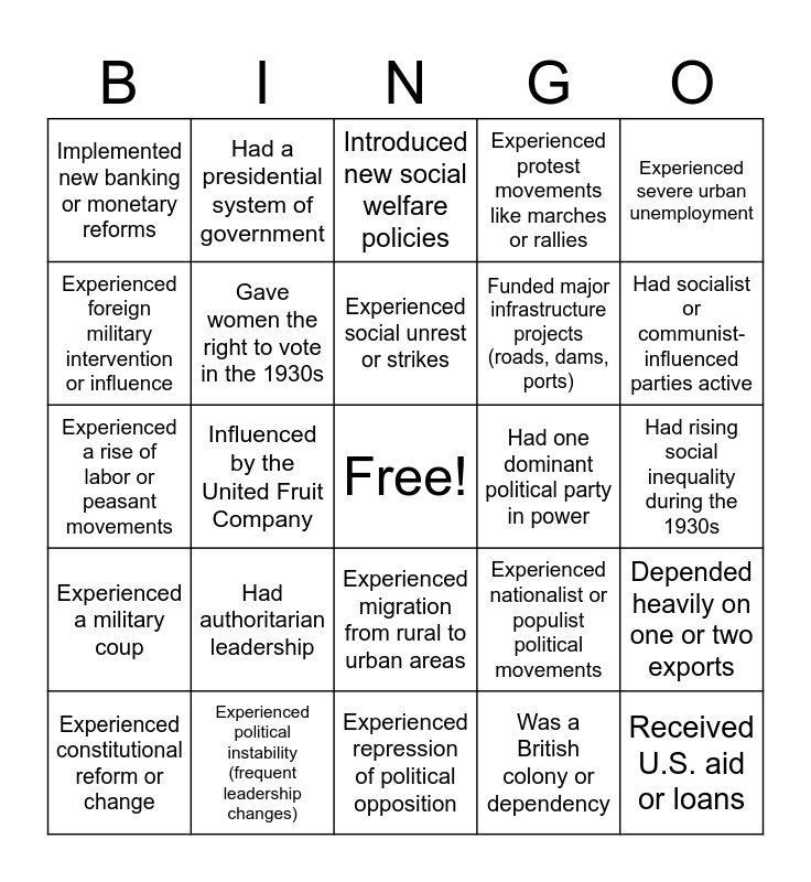 This bingo card has a free space and 32 words: Was a British colony or dependency, Had significant U.S. economic influence, Influenced by the United Fruit Company, Implemented massive public works projects, Experienced a military coup, Gave women the right to vote in the 1930s, Experienced severe urban unemployment, Depended heavily on one or two exports, Had a presidential system of government, Was a parliamentary democracy, Experienced social unrest or strikes, Introduced new social welfare policies, Experienced inflation or deflation crisis, Was affected by agricultural collapse, Had one dominant political party in power, Experienced foreign debt or credit crises, Experienced constitutional reform or change, Experienced a rise of labor or peasant movements, Experienced migration from rural to urban areas, Had authoritarian leadership, Experienced nationalist or populist political movements, Depended heavily on mining or resource exports, Had rising social inequality during the 1930s, Experienced political instability (frequent leadership changes), Received U.S. aid or loans, Experienced protest movements like marches or rallies, Funded major infrastructure projects (roads, dams, ports), Experienced foreign military intervention or influence, Implemented new banking or monetary reforms, Experienced repression of political opposition, Experienced electoral fraud or manipulation and Had socialist or communist-influenced parties active.