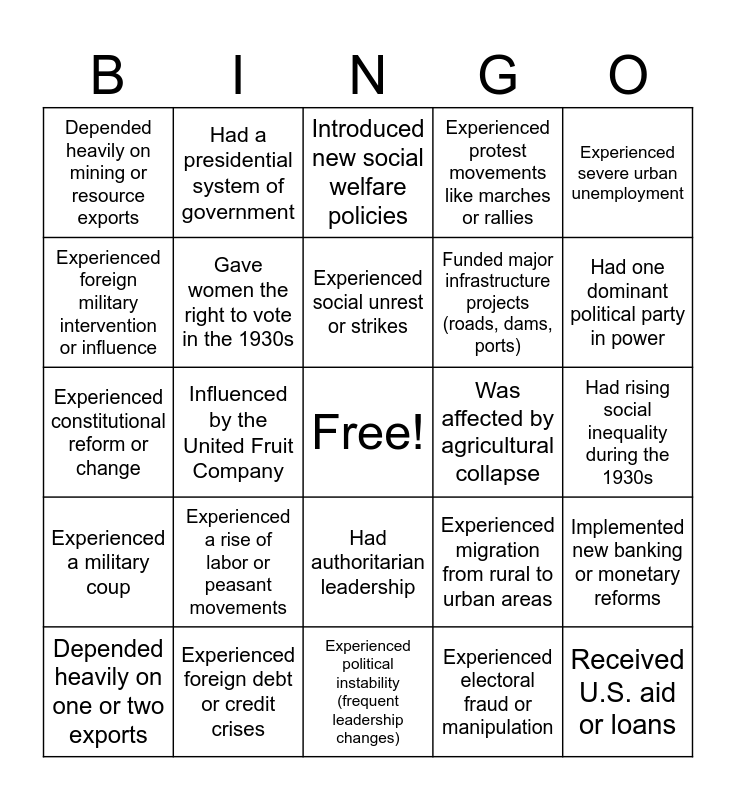 This bingo card has a free space and 33 words: Was a British colony or dependency, Had significant U.S. economic influence, Influenced by the United Fruit Company, Implemented massive public works projects, Experienced a military coup, Gave women the right to vote in the 1930s, Experienced severe urban unemployment, Depended heavily on one or two exports, Had a presidential system of government, Was a parliamentary democracy, Experienced social unrest or strikes, Introduced new social welfare policies, Experienced inflation crisis, Experienced deflation crisis, Was affected by agricultural collapse, Had one dominant political party in power, Experienced foreign debt or credit crises, Experienced constitutional reform or change, Experienced a rise of labor or peasant movements, Experienced migration from rural to urban areas, Had authoritarian leadership, Experienced nationalist or populist political movements, Depended heavily on mining or resource exports, Had rising social inequality during the 1930s, Experienced political instability (frequent leadership changes), Received U.S. aid or loans, Experienced protest movements like marches or rallies, Funded major infrastructure projects (roads, dams, ports), Experienced foreign military intervention or influence, Implemented new banking or monetary reforms, Experienced repression of political opposition, Experienced electoral fraud or manipulation and Had socialist or communist-influenced parties active.