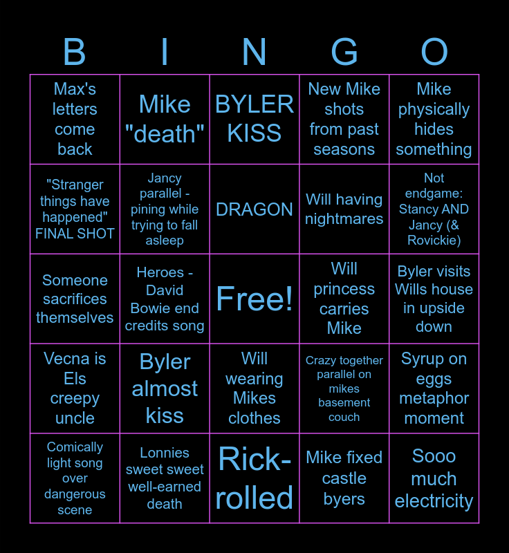 This bingo card has a free space and 24 words: Byler almost kiss, Lonnies sweet sweet well-earned death, DRAGON, Comically light song over dangerous scene, Mike physically hides something, Max's letters come back, "Stranger things have happened" FINAL SHOT, Mike "death", Will princess carries Mike, Will wearing Mikes clothes, Will having nightmares, Someone sacrifices themselves, Crazy together parallel on mikes basement couch, Syrup on eggs metaphor moment, Jancy parallel - pining while trying to fall asleep, Mike fixed castle byers, Byler visits Wills house in upside down, BYLER KISS, Not endgame: Stancy AND Jancy (& Rovickie), Heroes - David Bowie end credits song, Sooo much electricity, Vecna is Els creepy uncle, New Mike shots from past seasons and Rick-rolled.