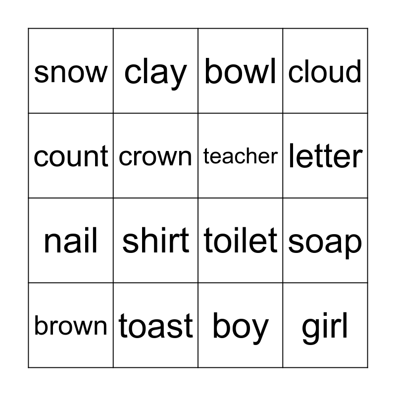 This bingo card has 16 words: toast, soap, bowl, snow, nail, clay, toilet, boy, count, crown, brown, cloud, shirt, letter, teacher and girl.