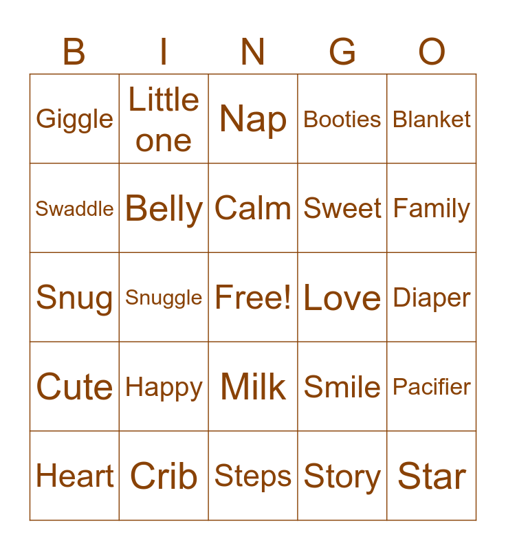 This bingo card has a free space and 70 words: Baby, Diaper, Bottle, Bib, Crib, Rattle, Booties, Wipes, Blanket, Onesie, Pacifier, Cuddle, Giggle, Nap, Burp, Snuggle, Milk, Sweet, Tiny, Cute, Love, Smile, Family, Dream, Blessing, Sleep, Hugs, Kisses, Story, Lullaby, Little one, Bundle, Joy, Laugh, Stork, Duck, Toy, Car seat, Socks, Swaddle, Soft, Happy, Star, Glow, Tummy, Belly, Heart, Nest, Cloud, Moon, Sunshine, Magic, Wishes, Grow, Steps, Flutter, Calm, Lovebug, Hopes, Cherish, Snug, Peace, Yawn, Warm, Cozy, Cradle, Shower, Gift, New life and Miracle.