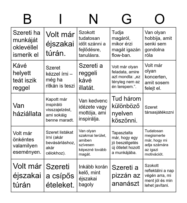 This bingo card has 25 words: Szeret listákat írni (akár bevásárláshoz, akár célokhoz)., Inkább korán kelő, mint éjszakai bagoly, Szereti a reggeli kávé illatát., Volt már éjszakai túrán, Van olyan hobbija, amit senki sem gondolna róla, Szereti ha munkáját oklevéllel ismerik el, Kávé helyett teát iszik reggel, Volt már éjszakai túrán., Tud három különböző nyelven köszönni., Van olyan szakmai terület, amiben szívesen képezné tovább magát., Volt már olyan feladata, amire azt mondta: „ez tényleg nem az én terepem.”., Van háziállata, Tapasztalta már, hogy egy jó beszélgetés új ötletet hozott a munkájába., Tudatosan megismerte már, hogy mi adja számára az igazi motivációt., Szeret kézzel írni – még ha ritkán is teszi, Szokott reflektálni a nap végén arra, mi ment jól és min lehet javítani., Szeret társasjátékozni, Szokott tudatosan időt szánni a fejlődésre, tanulásra., Volt már olyan koncerten, amit sosem felejt el., Kapott már inspiráló visszajelzést, ami sokáig benne maradt., Van kedvenc idézete vagy mottója, ami inspirálja., Szereti a csípős ételeket., Volt már önkéntes valamilyen eseményen., Tudja magáról, mikor érzi magát igazán flow-ban. and Szereti a pizzán az ananászt.