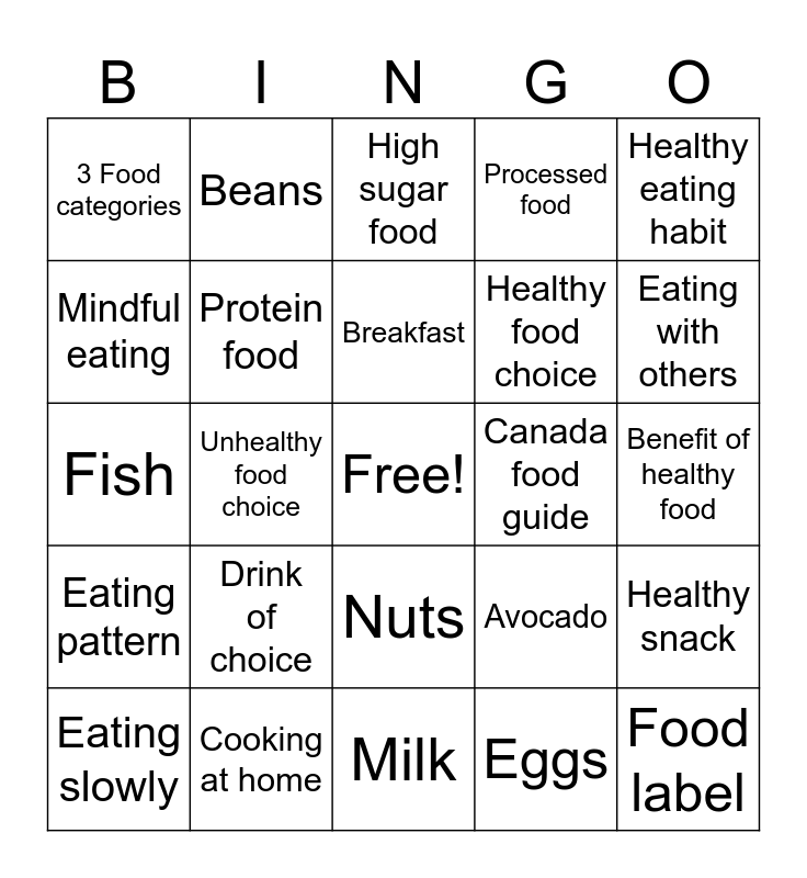 This bingo card has a free space and 38 words: Fruit, Vegetable, Whole grain food, Protein food, Healthy snack, Drink of choice, Breakfast, Lunch, Healthy eating habit, Healthy food choice, Unhealthy food choice, Processed food, Food label, Benefit of healthy food, Mindful eating, Eating pattern, High sodium food, High sugar food, Plant-based protein, Canada food guide, 3 Food categories, Cooking at home, Eating with others, Eating slowly, Cheese, Milk, Brown rice, Wild rice, Low-fat Yogurt, Low-fat milk, Oatmeal, Nuts, Eggs, Beans, Meat, Avocado, Fish and Kiwi.